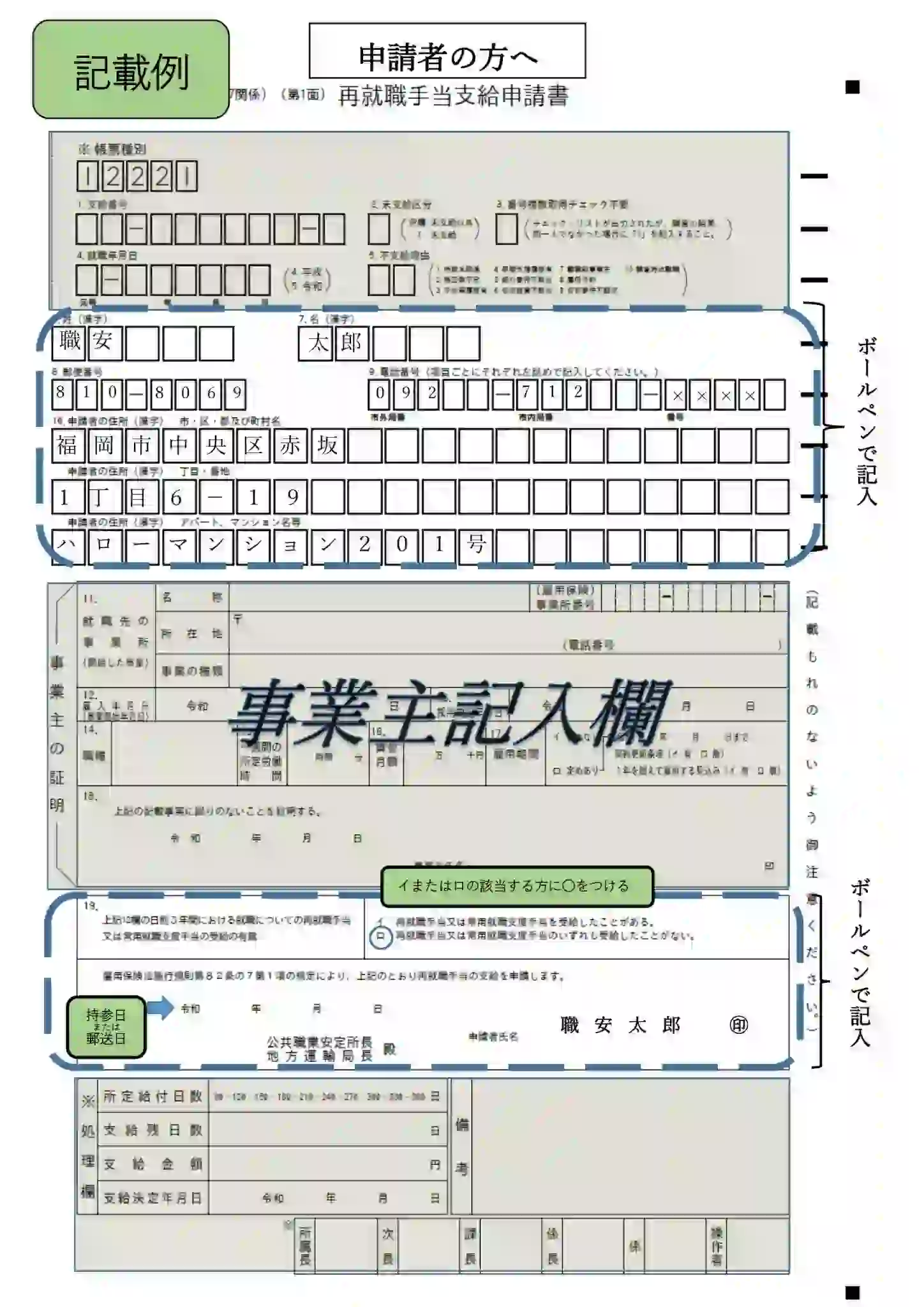 再就職手当の支給申請書を記入する際には、以下の点に注意してください: