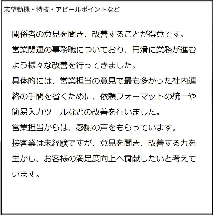 1. コミュニケーションスキル:明るく丁寧な対応ができることが強みです。お客様とのコミュニケーションを通じて、信頼関係を築くことができます。