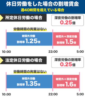 - この期間に労働した場合、通常の時間外労働の賃金に 125% を乗じた額が支払われる。