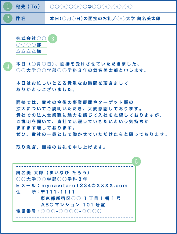 - 冒頭:面接者に感謝の言葉を伝え、面接日時を明記する。