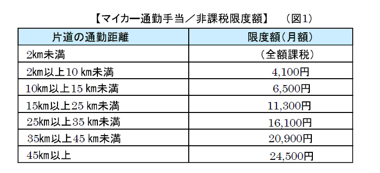 - 会社の所在地:東京都の場合、通勤距離が10km以上19km未満の場合は、月額100,000円が非課税限度額となります。