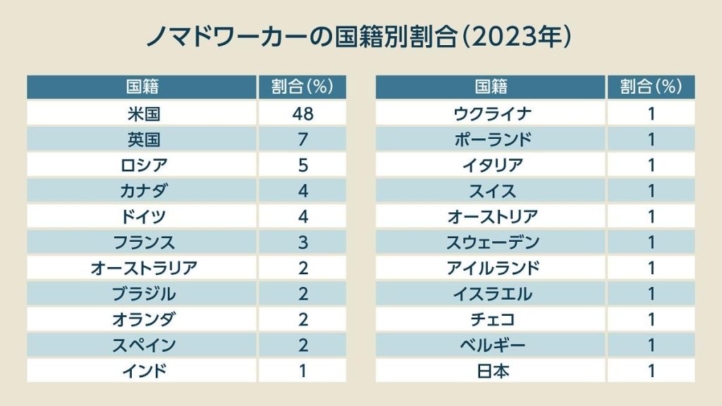 日本におけるノマドワーカーの人口は確実な統計は存在しませんが、推定では2021年時点で約130万人とされています。これには完全に移動しながら働く人々だけでなく、週に数日はリモートワークを行いつつ、他の日はオフィスに通う人々も含まれています。というのも、日本の働き方改革により、フレキシブルな勤務形態が推進されているため、ノマドワーカーの定義も広がっています。