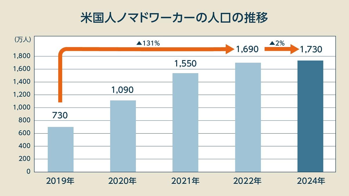 日本におけるノマドワーカーの人口は確実な統計は存在しませんが、推定では2021年時点で約130万人とされています。これには完全に移動しながら働く人々だけでなく、週に数日はリモートワークを行いつつ、他の日はオフィスに通う人々も含まれています。というのも、日本の働き方改革により、フレキシブルな勤務形態が推進されているため、ノマドワーカーの定義も広がっています。