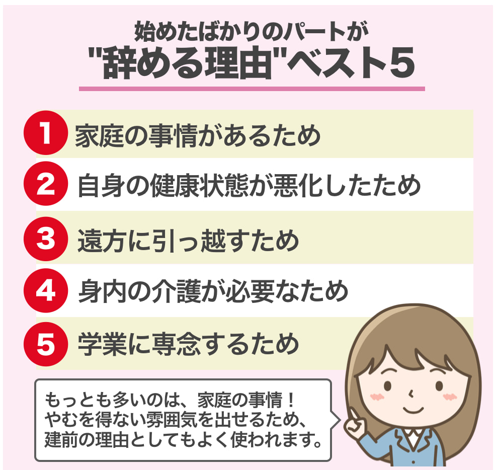 - 生活状況の変化:家族や健康の理由、転居などにより、現在のパートを続けることができない