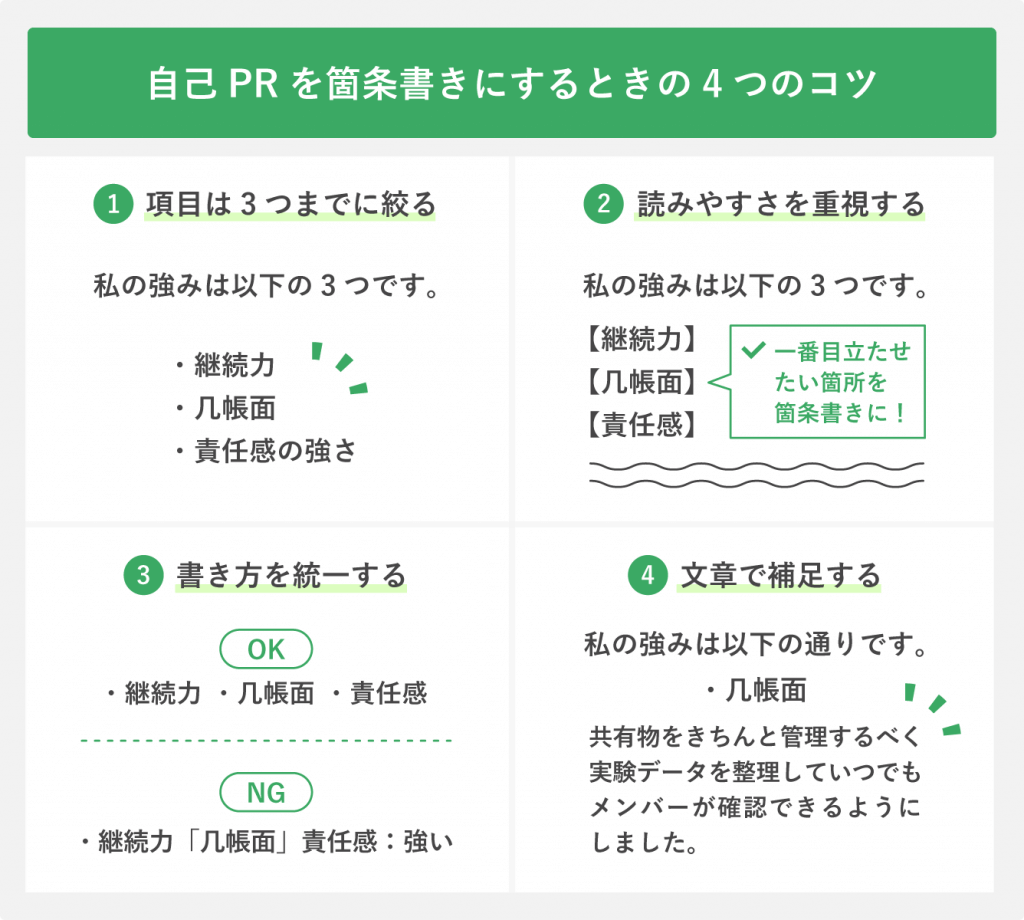 自己PRの書き方 | 過去の経験やエピソードを使い、具体的な事例を挙げて強みをアピール。 |