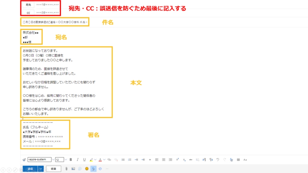 面接辞退メールを書く際のフォーマットと構成には、以下の要素が含まれます。