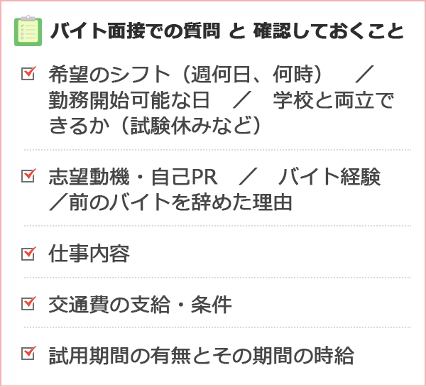 面接官は、あなたがこのバイトにどれだけ熱意を持っているかを知りたいと思っています。自分の意気込みややる気を具体的に伝えましょう。 例の質問: - このバイトに応募した理由は? - このバイトで何を学びたいですか? - このバイトでの目標はなんですか? 回答例: - 「このバイトに応募した理由は、○○業界に興味があり、実際の現場で働いてみたかったからです。また、○○のスキルを身につけたいという思いも強いです。」 - 「このバイトでは、接客のスキルやチームワークの重要性を学びたいです。特に、お客様とのコミュニケーション力を向上させることを目標にしています。」 - 「このバイトでの目標は、1年以内に店長から信頼されるスタッフになることです。そのためには、まずは基本的な業務を丁寧にこなすことが大切だと思っています。」