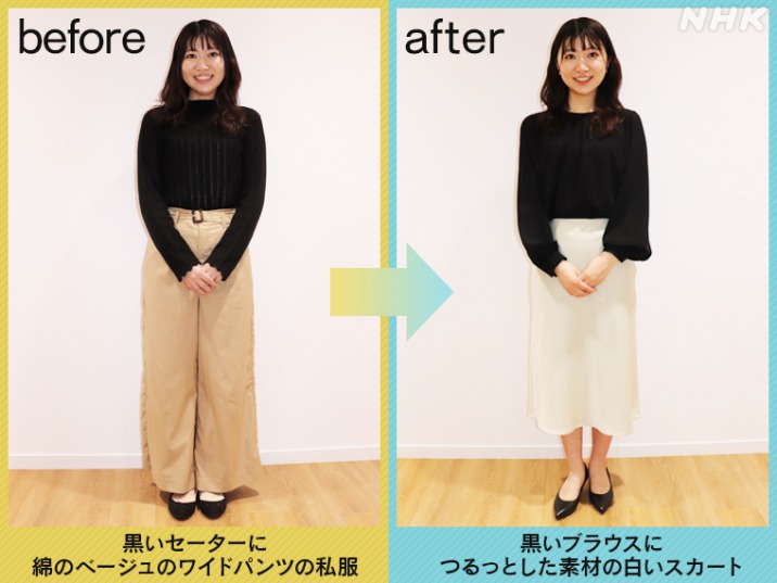- パンツかスカート:パンツはスラックスやチノパン、スカートは膝丈のもので、カジュアルすぎないものを選びましょう。