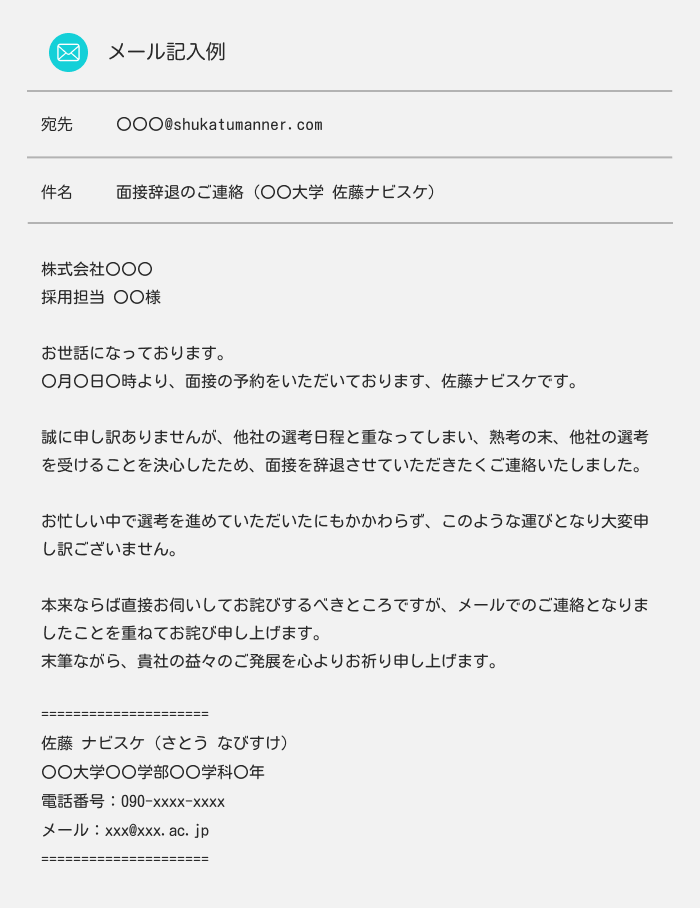 - 件名: 面接の辞退を明示的に示す(例:「面接のご辞退について」)