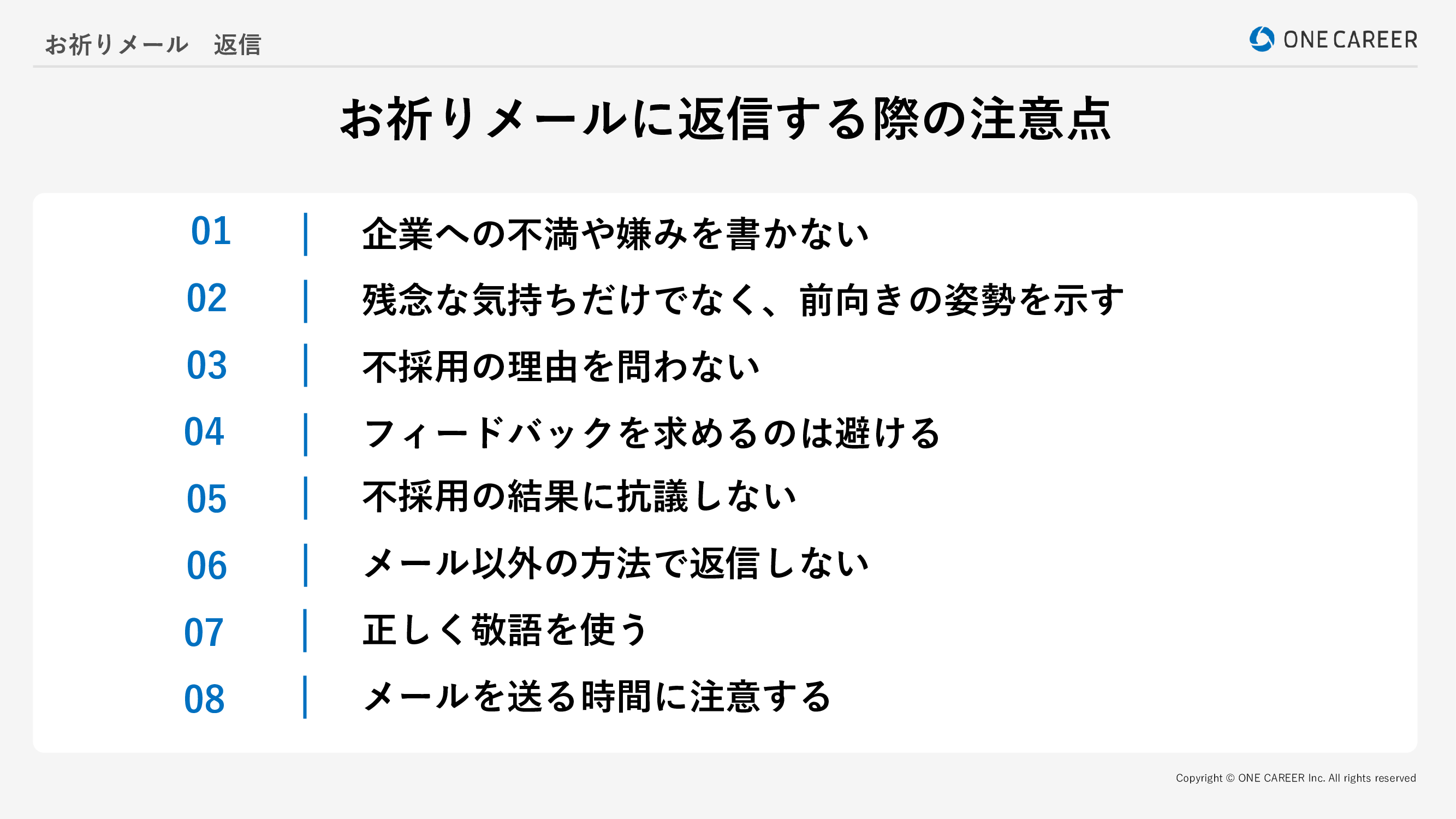 不採用メールに返信する際には、以下の点に注意することが大切です: