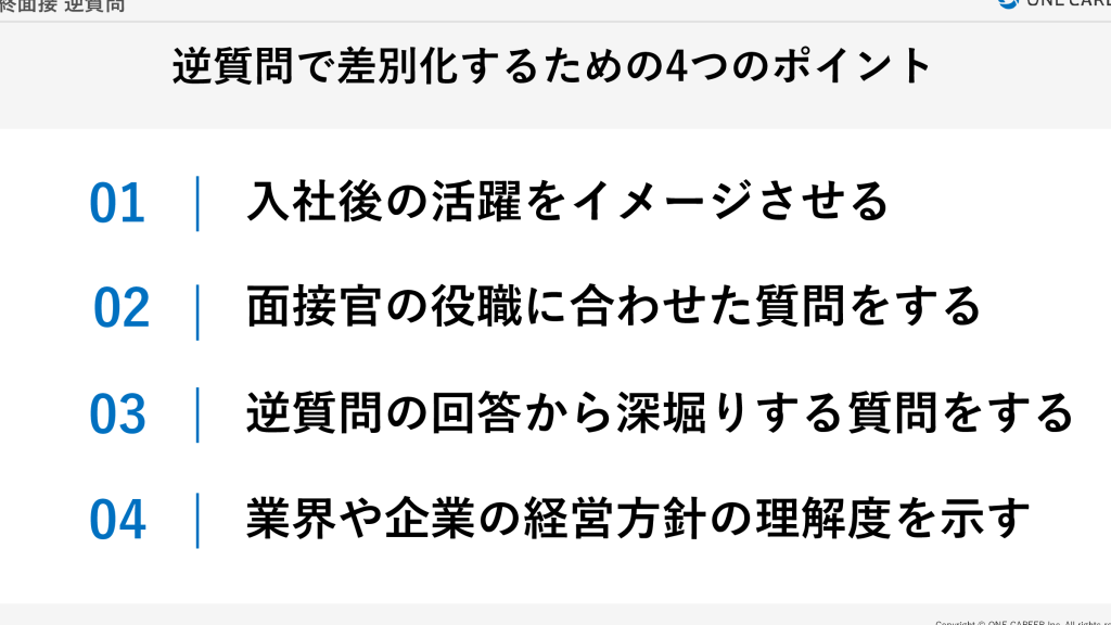 - 面接の終盤に逆質問の時間を設ける企業が多いことを確認する。