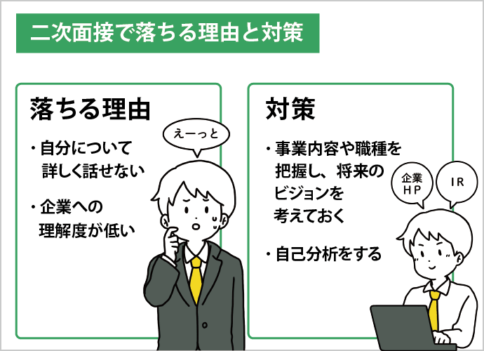 二次面接では、自己PRや志望動機について深く掘り下げられることが多く、自己分析が不十分な人はここでつまずく傾向があります。自己分析が不十分な場合、自分の強みや弱みを明確に説明できず、企業が求める人物像と一致しないと判断される可能性があります。