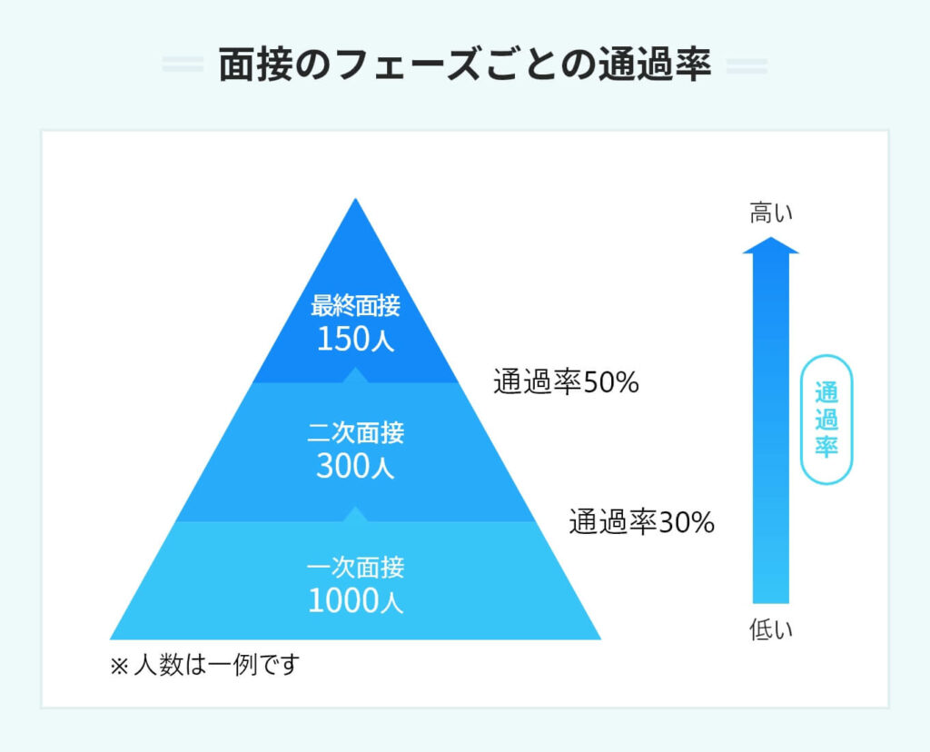 二次面接の通過率は会社によって大きく異なりますが、一般的には一次面接と比べて低い傾向にあります。これは、二次面接ではより専門的な知識やスキル、会社とのフィット感を評価するためです。一次面接を通過したことで、基本的な要件をクリアしていることが確認されていますが、二次面接ではより高度な評価が行われます。そのため、通過率は低い可能性があります。