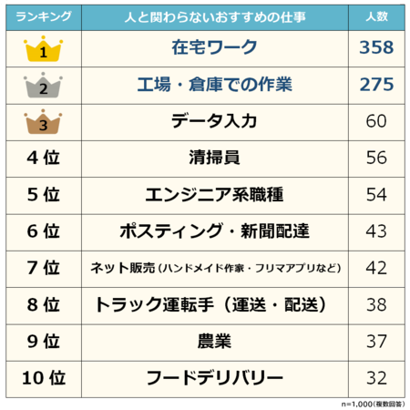 - 研究者:科学研究や実験を行う職業で、多くの場合、自宅や研究所で個々に作業を行います。