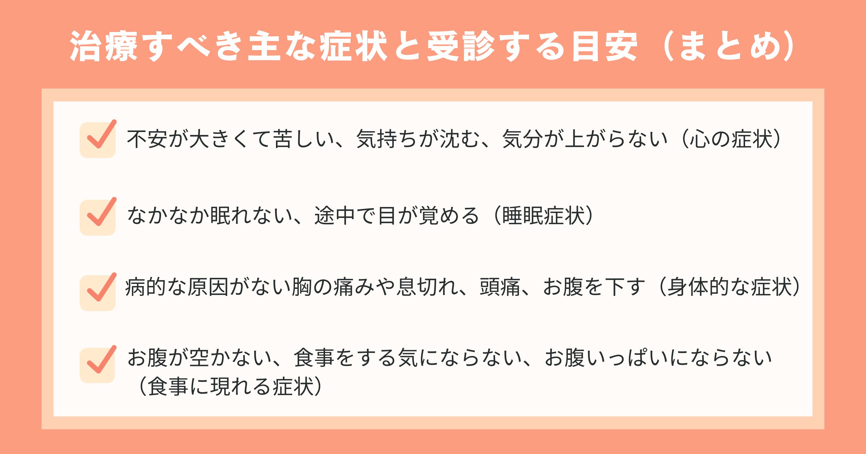 持続的な不安や抑うつの気分が日常の生活に影響を及ぼしている場合、心療内科の助けが必要かもしれません。これらの感情が数週間以上続く場合、特に注意が必要です。以下に具体的な症状を列挙します。
