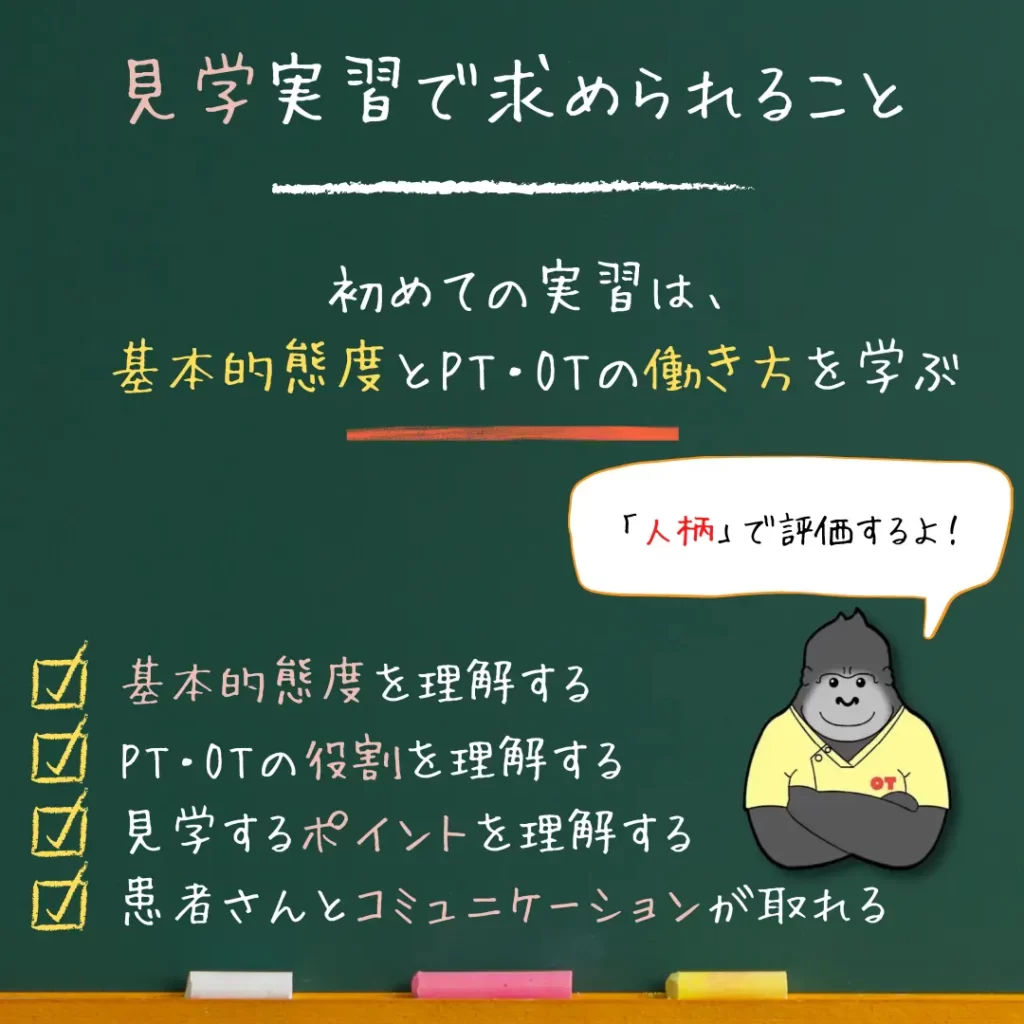 実習の目的は、作業療法士として必要な知識と技能を身につけることです。具体的には、患者さんの日常生活動作(ADL)の評価、症状に応じたプログラムの立案、リハビリテーションの実施などを行います。実習では、以下のような活動が含まれます: