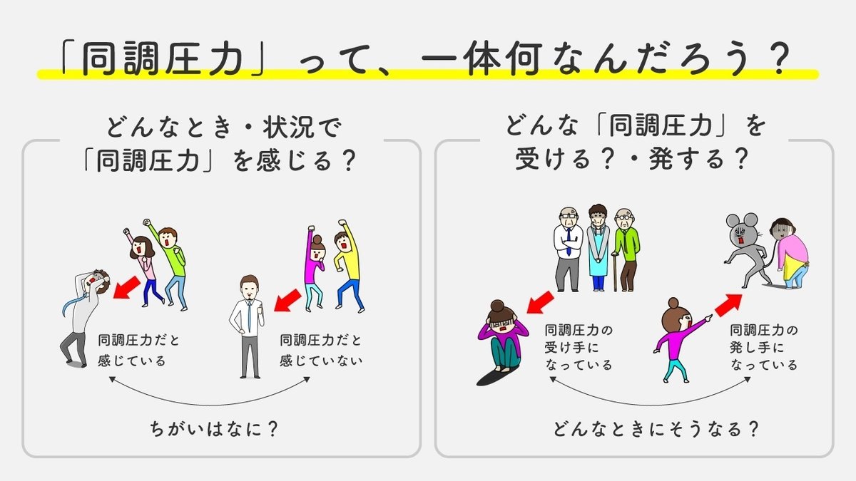 同調圧力は、集団内での一貫性や調和を維持するための社会的圧力のことを指します。これは、集団内の他のメンバーと同様の意見や行動を示すことによって、受け入れられたり、排除されないようにするために感じられるプレッシャーです。この圧力が強すぎると、個々の意見や価値観を無視して集団に従うことが求められ、精神的なストレスや不快感につながることがあります。