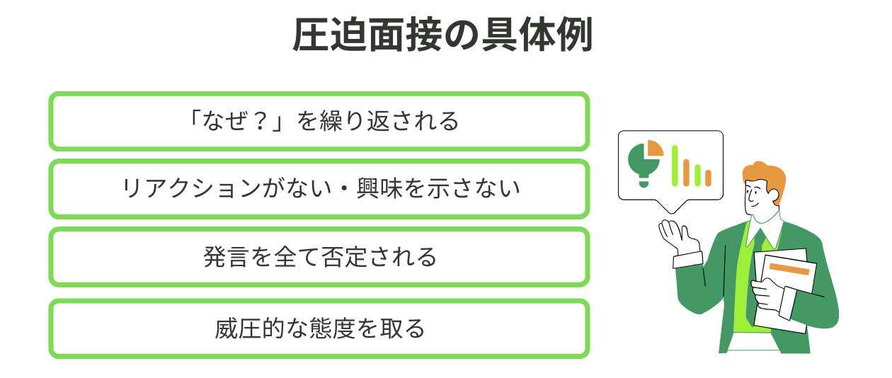 圧迫面接にはいくつかの一般的なパターンが存在します。主なパターンは以下の通りです: