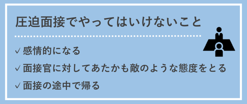 圧迫面接では、求職者がストレス状態になることを意図的に誘導することがありますが、そのような状況であっても、求職者が攻撃的な言動を取るべきではありません。攻撃的な態度は、あなたの感情的コントロール能力が低いことを示す可能性があります。冷静さを保つことが重要です。以下に注意すべき点を挙げます: