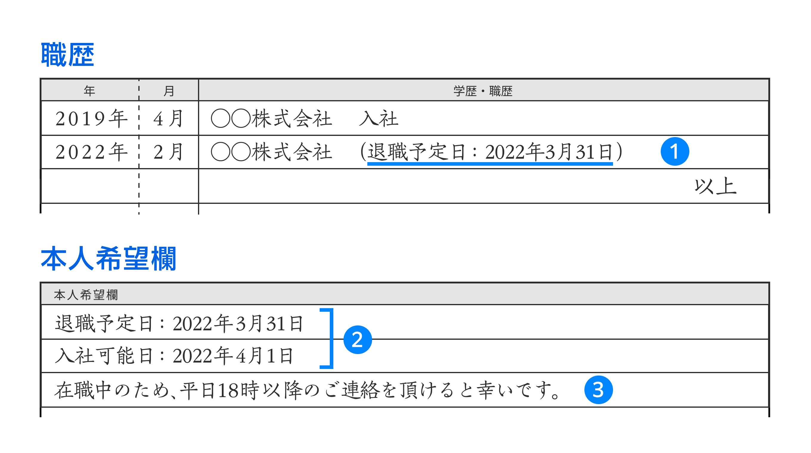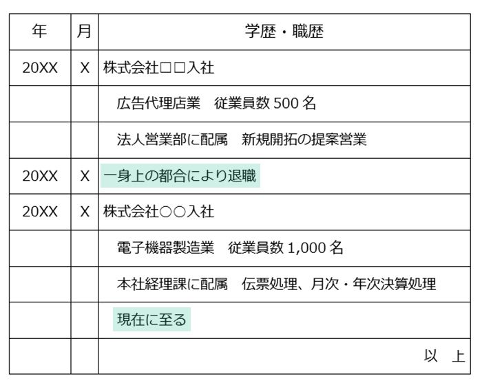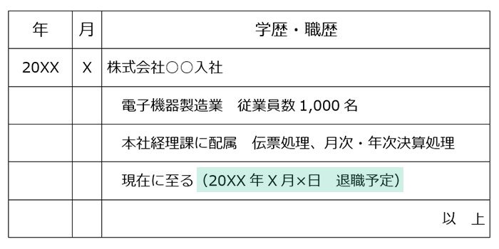 履歴書の退職予定日は、職歴欄の最新の経歴の欄に記載します。具体的には、以下の構成を参考にください。