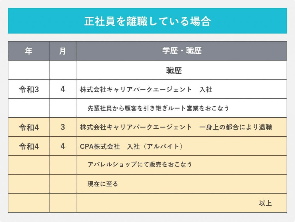 - 職種:「コンビニエンスストア店員」や「飲食店ホールスタッフ」など、具体的な職種を記載します。