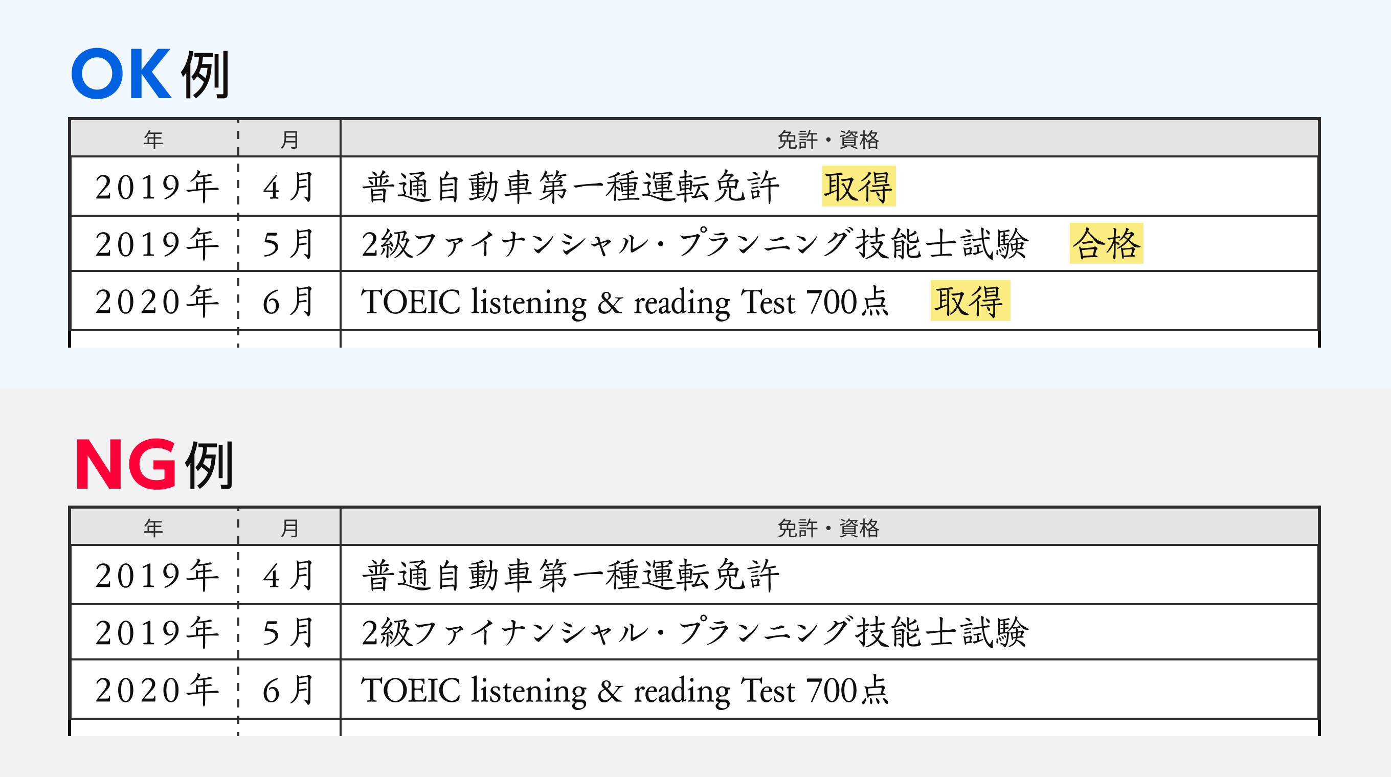 免許・資格の記載方法の基本 資格名、取得年月、発行機関を正確に記入