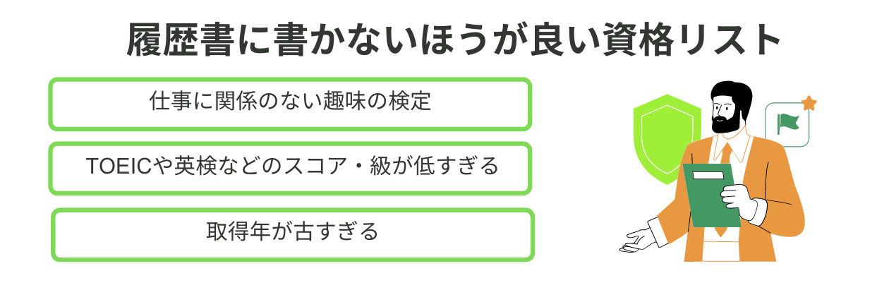 履歴書に書かないほうがいい資格は、必ずしも関連性のない資格や非常に一般的な資格、そして期限切れになっている資格です。これらの資格は、応募する職種や業界との関連性が低かったり、あまり価値がなかったり、逆にマイナスの印象を与えたりする可能性があります。履歴書を効果的に作成するために、資格欄には直接関連する資格や競争力のある資格を記載することが推奨されます。