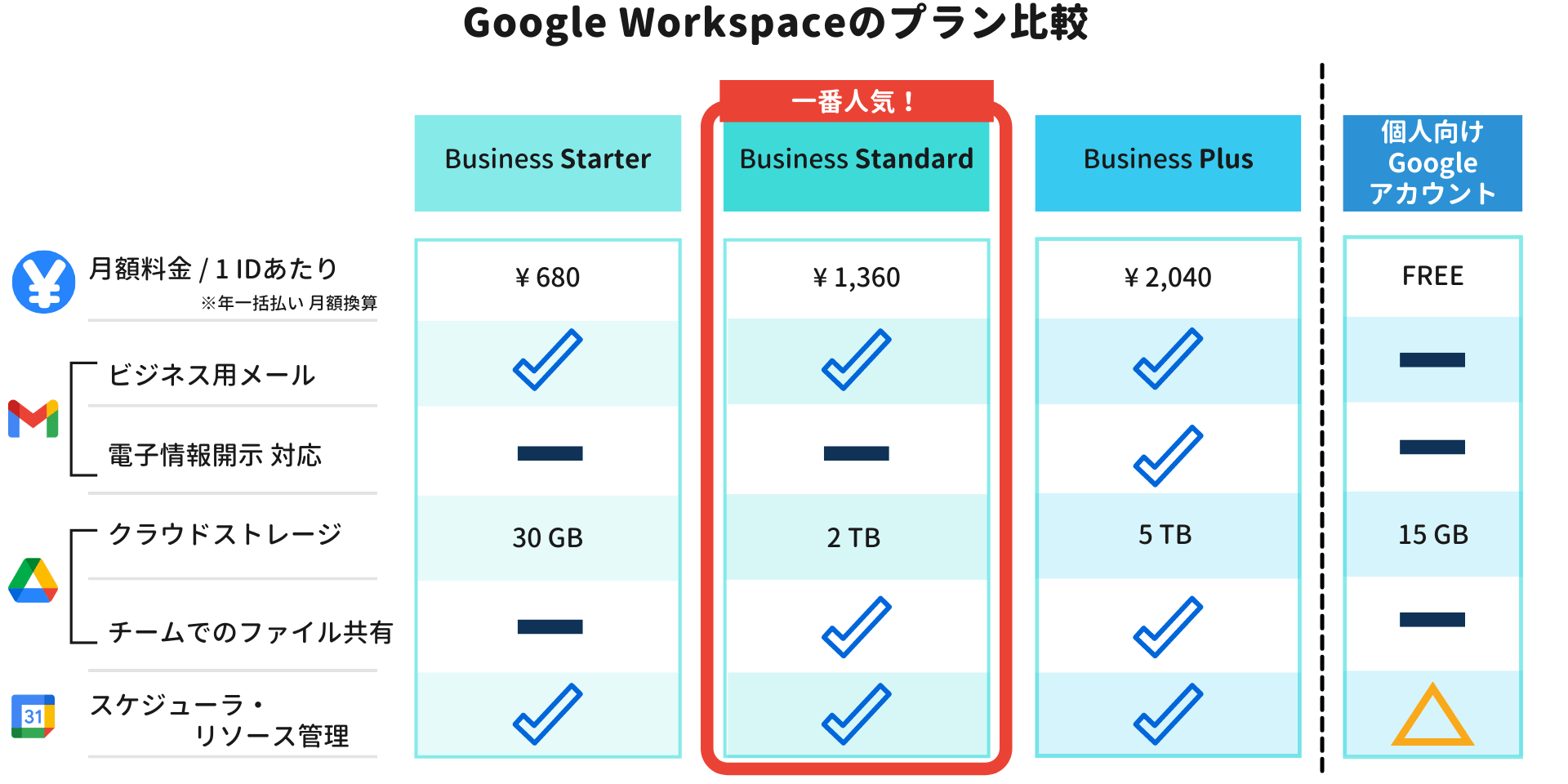 Google Workspace はさまざまなプランを提供しており、企業のニーズに合わせて選択できます。