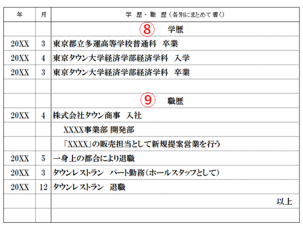 - 各職歴を逆年月順に並べ、最近のものから記載する。