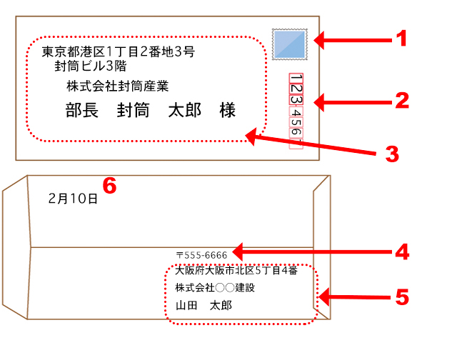 - 郵便番号:宛名の上に郵便番号を書き、差出人の上には差出人の郵便番号を書きます。