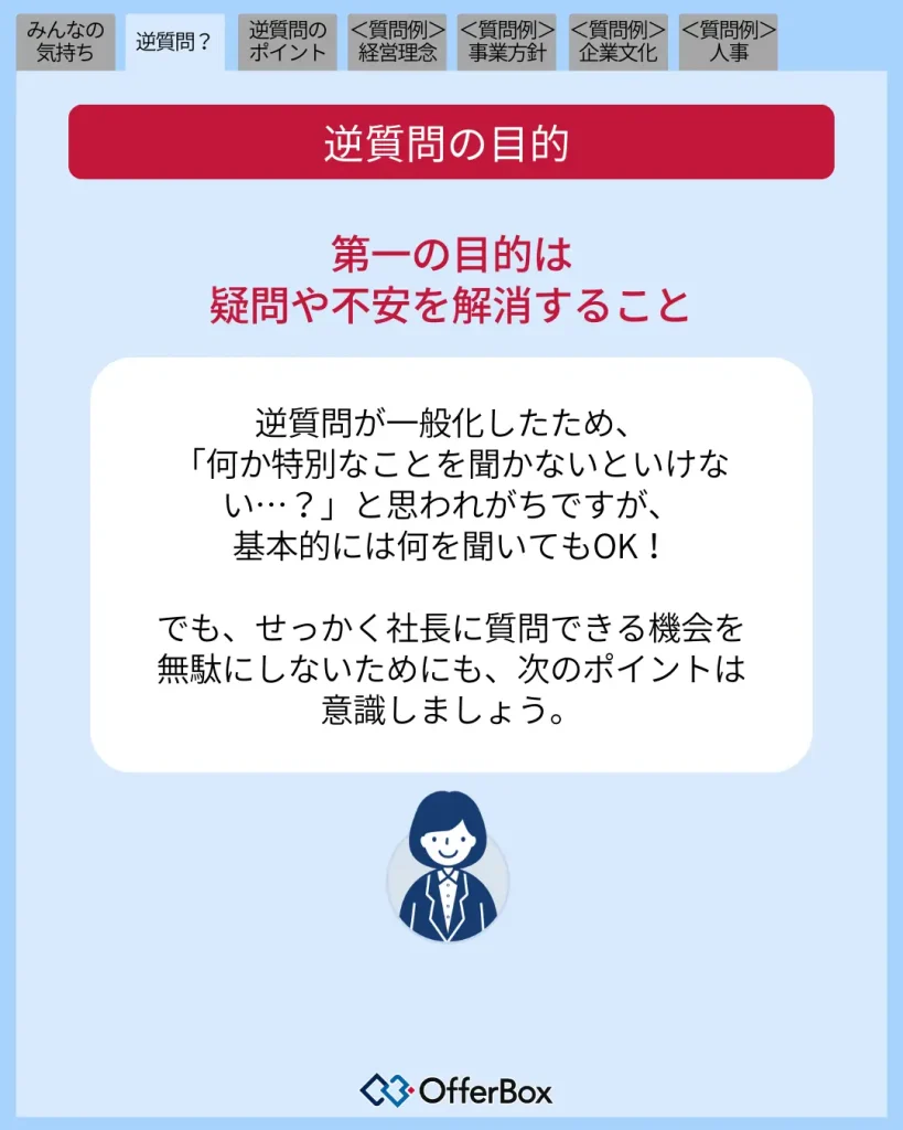 - 逆質問は、あなたの面接に対する準備度と意欲を示す重要な機会です。