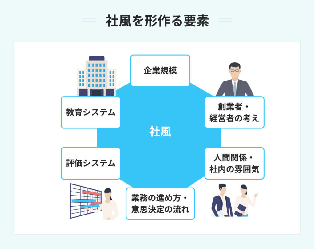社風は、企業内の日々の雰囲気や様式を指し、具体的な行動や習慣として現れます。社風は、企業文化の具体的な表現であり、組織内のコミュニケーションや業務遂行の方法に反映されます。社風は、従業員の満足度や生産性に影響を与え、組織の雰囲気を決定する重要な要素です。