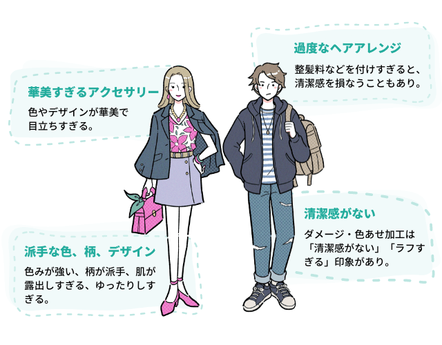- 派手なアクセサリー:过大なアクセサリーや香水は避け、シンプルに保つと良いです。