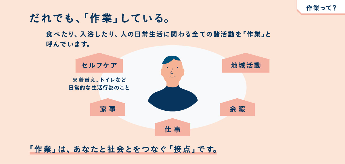 作業療法士を一言で言うと、患者や高齢者の生活機能の回復や向上を支援する専門職のことです。作業療法士は、日常生活における様々な活動を通じて、利用者ひとりひとりの生活の質を向上させることが目的です。具体的には、 self-care(自己管理)、work(労働)、leisure(余暇活動)といった生活場面のなかで、利用者が自立した生活を送れるようサポートします。また、心身の機能障害や生活環境への適応に合わせて、個別的な介入計画を作成し、実施します。