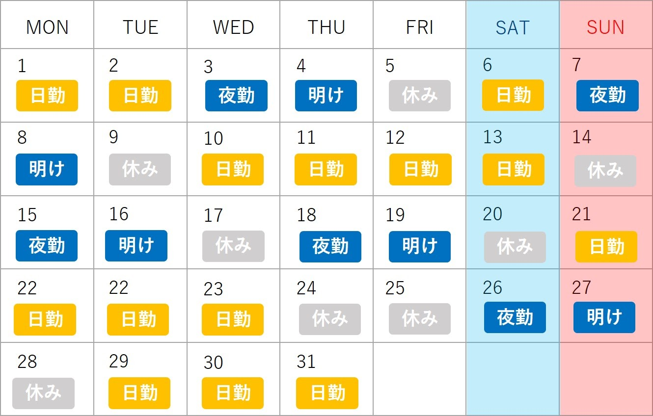 勤務時間 | 日勤(8:00 - 16:00)、夕勤(16:00 - 24:00)、夜勤(24:00 - 8:00) |