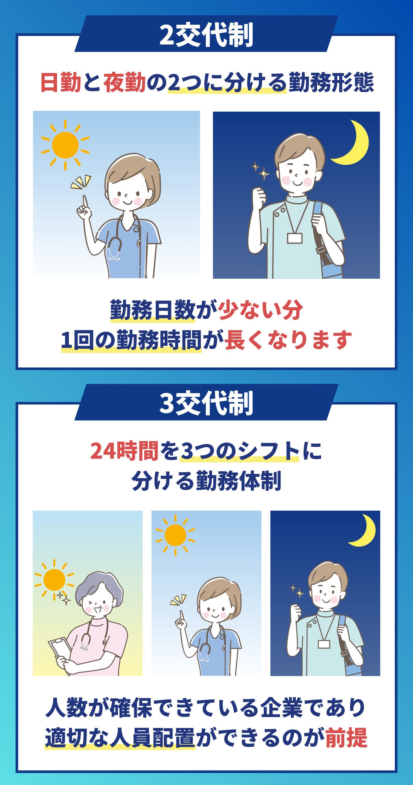 - 24時間体制の看護が必要な施設では、3交代制が適している。