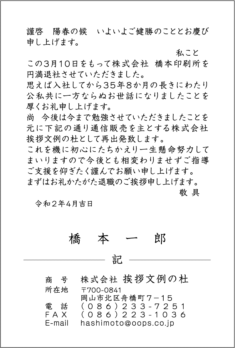 いつもお世話になっておりました。この度、私の個人的な事情により、日にちに退職することとなりました。これまで御社の一員として働かせていただける機会を与えていただき、心から感謝しております。