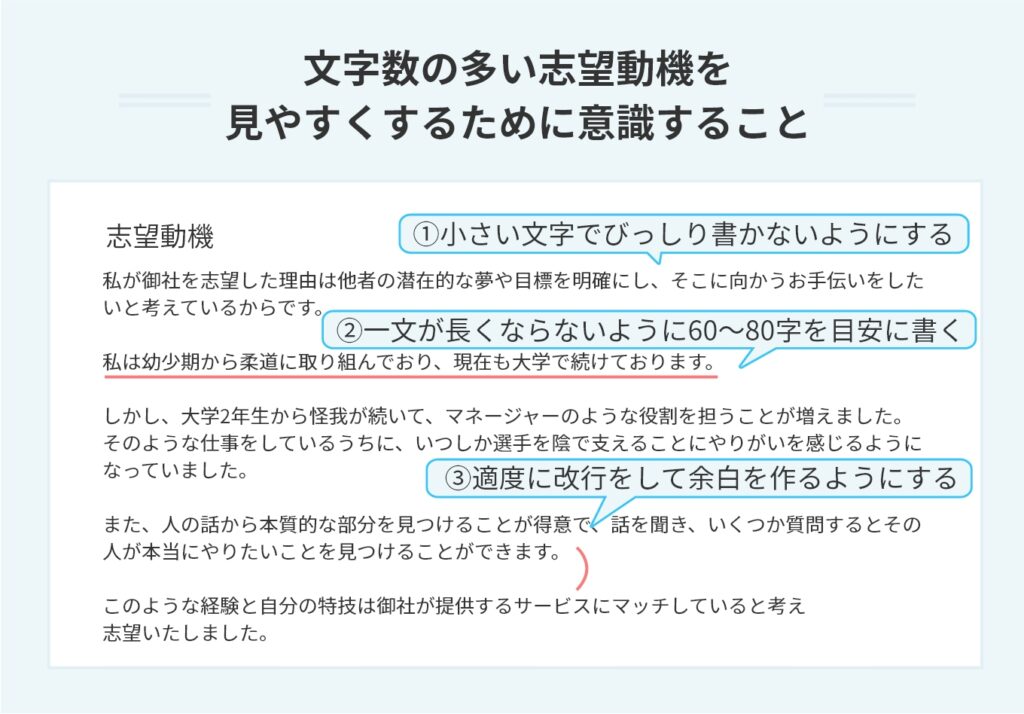 - 企業や施設とのマッチ度が高いかどうか。応募先の特徴や理念に合致した動機を述べることで、応募者の熱意が伝わります。
