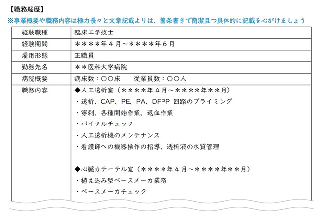 経験は、具体的かつ詳細に記載することが重要です。以下に具体的な書き方の例を示します。 | 項目 | 内容 | |------|------| | 経験 | 2021年7月 - 2021年9月 ○○病院 なし