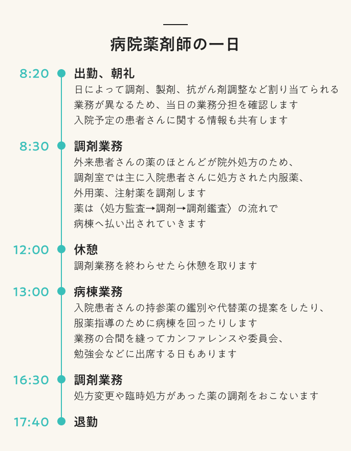 病院薬剤師は、医師の指示に基づいて患者に薬物療法を提供し、安全で効果的な治療をサポートします。主な業務には以下が含まれます: