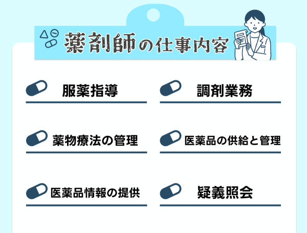 薬剤師は、医師が発行した処方箋を正確に調剤する役割を担っています。具体的には、以下の業務が含まれます。