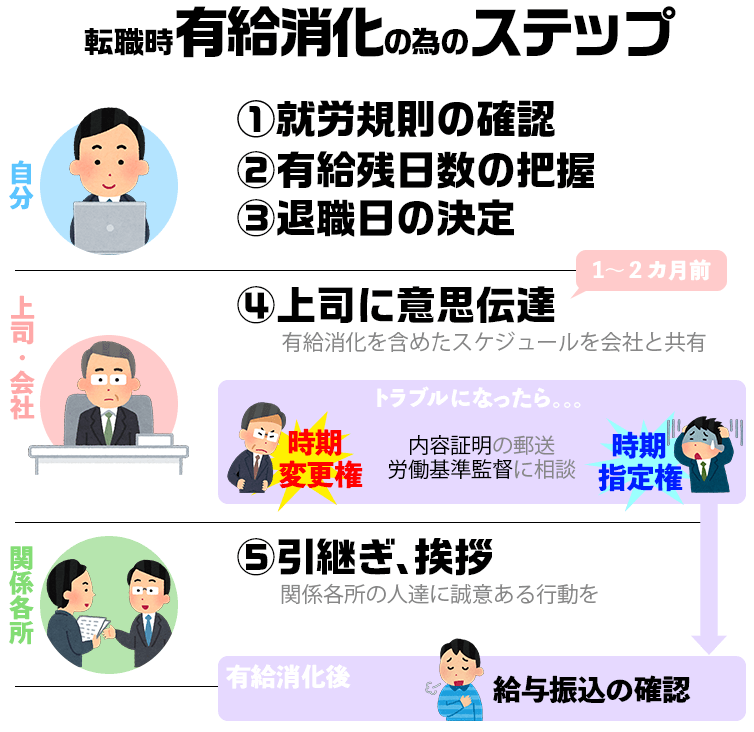 - 申請タイミング:通常、有給休暇の申請は、退職の1か月前までに行う必要があります。会社によっては必要書類の提出も求められる場合があります。