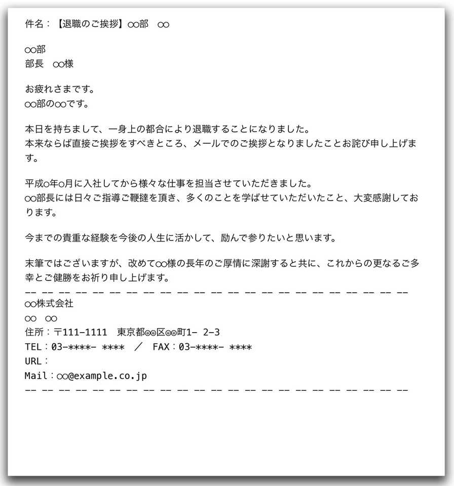 この度は、○○年の勤務をもって退職することとなりました。退職日は○月○日となります。○○年間、厚くご指導いただき、心より感謝申し上げます。