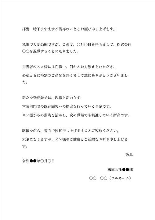 いつもお世話になっています。この度は突然の連絡となり申し訳ありませんが、私事ではございますが、XXX日をもって退職することとなりました。XXX社での経験は私のキャリア形成において大変貴重なものとなり、XXX様やチームの皆様には深く感謝しております。