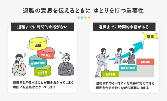 退職を伝える最適なタイミングは、会社によって異なるかもしれませんが、一般的には退職予定日の2週間から1ヶ月前に伝えすることが望ましいとされています。これは、会社が新たな人材を募集したり、残務を整理したりする時間を確保するためです。また、そのタイミングで退職の意思を伝えることで、自分自身もスムーズに次のキャリアステップへと進むことができます。ただし、会社の規定に従って退職通知の期限がある場合は、その期限に合わせて伝えることが大切です。