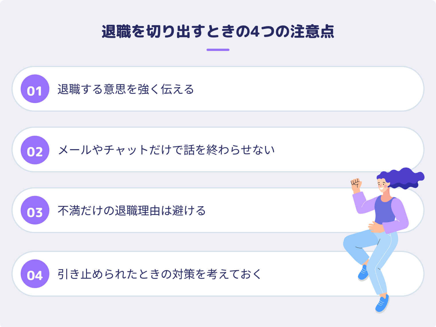 - 退職意思を伝えるタイミングを慎重に選ぶ。