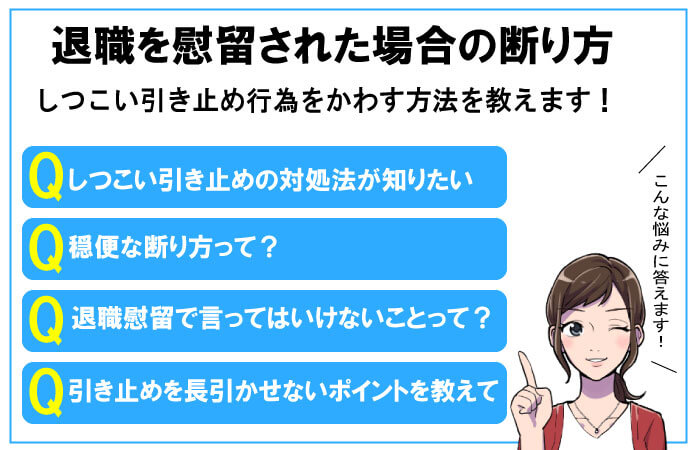 - 相手の感情を理解し、感謝の意を示す。引き止められるということは、あなたの価値が認められている証でもあるため、そのことに感謝の意を表す。