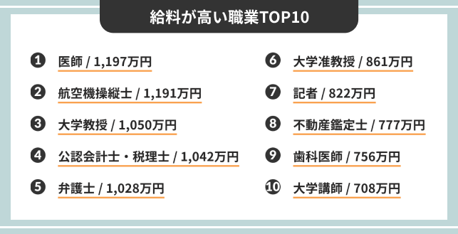 - 専門的な資格: 会計士や薬剤師など、国家資格や専門資格が必要な職業が多い。