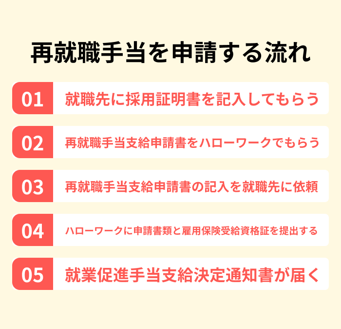 åå°±è·æåœãå絊ããã«ã¯ã以äžã®æé ã«åŸã£ãŠç³è«ãè¡ãå¿ èŠããããŸãã 1. éè·åŸãéããã«æå¯ãã®ãããŒã¯ãŒã¯ã«çžè«ã«è¡ãã 2. å¿ èŠãªæžé¡ïŒé¢è·ç¥šãæ±è·ç¥šãªã©ïŒãæºåããã 3. åå°±è·æåœã®ç³è«æç¶ããè¡ãã 4. æ±è·æŽ»åã®ç¶æ³ã宿çã«å ±åããã ç³è«ãæ¿èªãããã°ãäžå®ã®æéå ã«æ¯æã®æåœãæ¯çµŠãããŸãã Detailed information on the application process can also be found on the ãããŒã¯ãŒã¯ website or by visiting the nearest office.