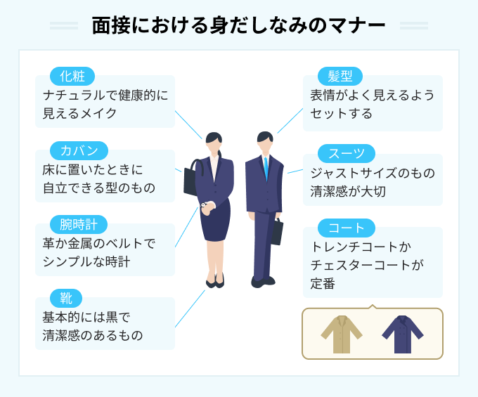 服装 | 清潔で適切な服装であることが重要です。ビジネススーツやネクタイ、靴は忘れずにチェックしましょう。 |